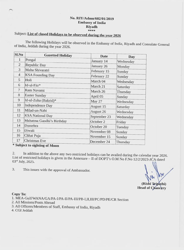 The following holidays will be observed in the Consulate General of India, Jeddah during the year 2026: